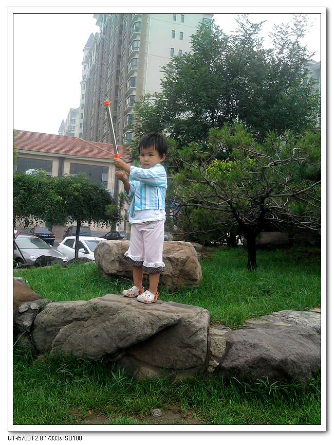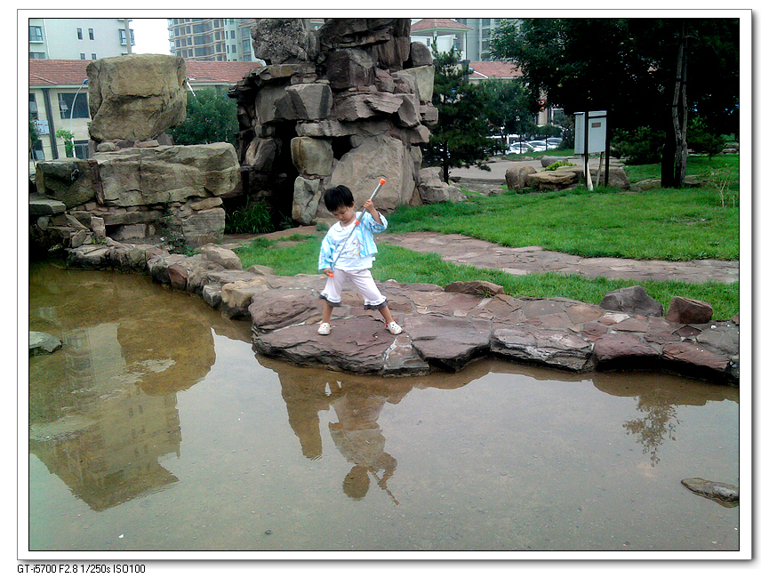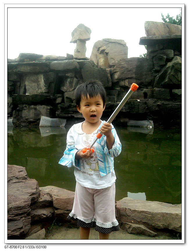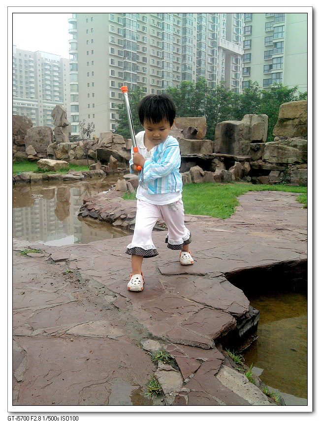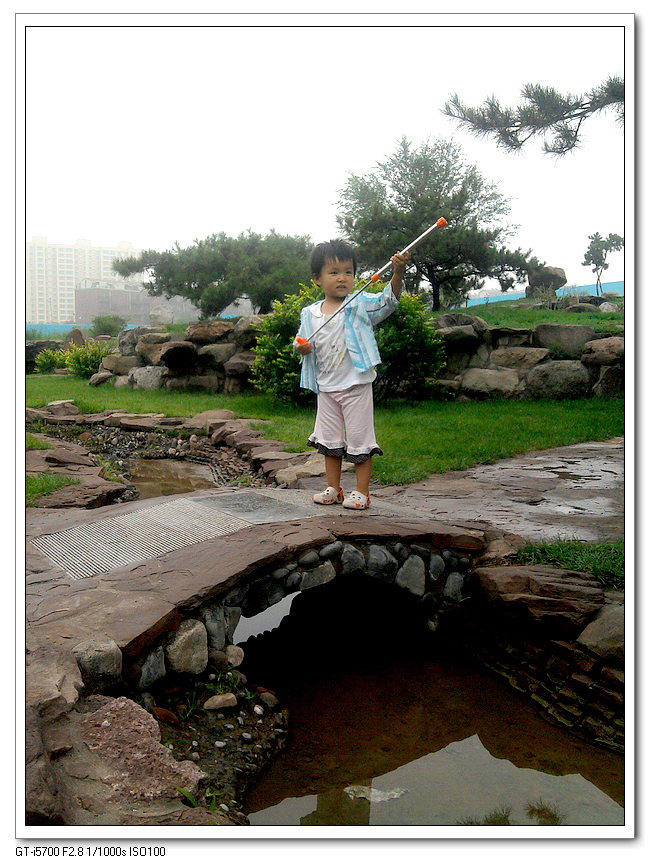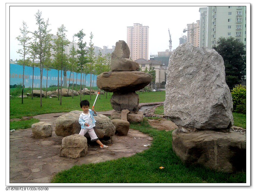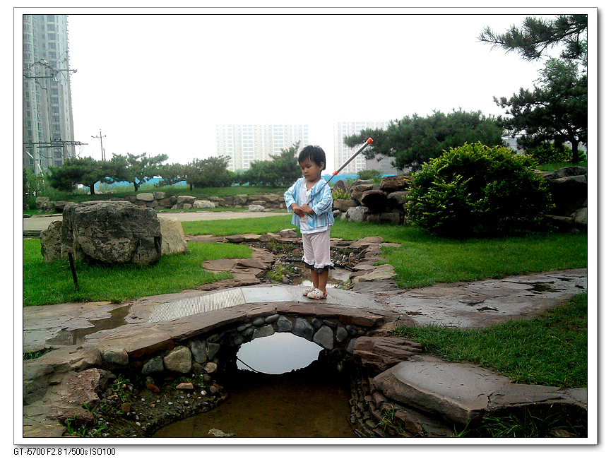 因为文化的断层,对古典的东西总是抱着向往,看到古朴的景色也更让人心静。周围高楼耸立,走在这小小小小的公园里却感觉时间凝滞,声音隔绝。拿手机给宝宝照了几张照片,整理时才发现,景色没照出什么来,宝宝舞“枪”的姿势倒是不少。