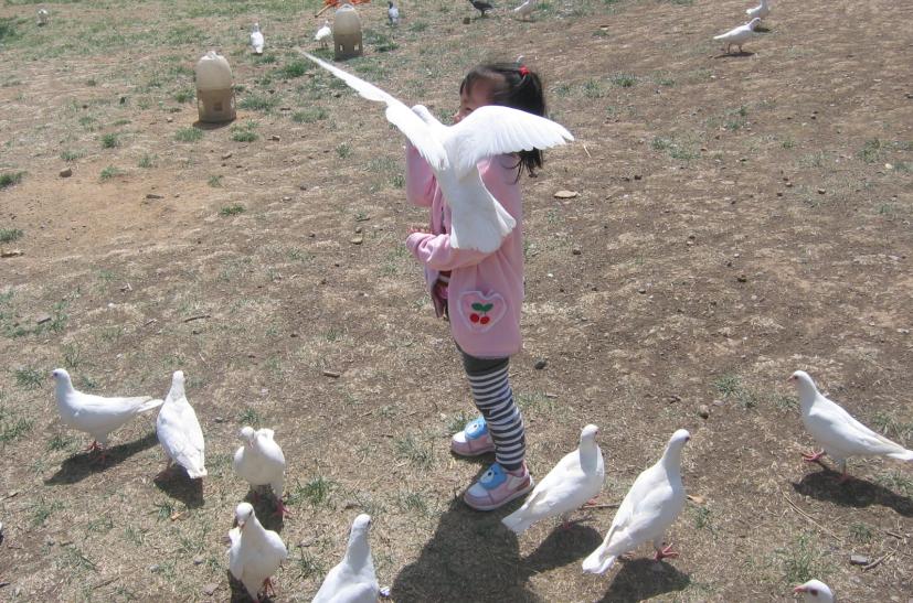 最令我快乐的是和爸爸一起在草地上喂鸽子,白色的、灰色的、花花的,那些可爱的鸽子淘气的落在我的头顶上、胳膊上、腿腿上,轻轻的啄着我手里的食物,痒痒的,很好玩。鸽子们争先恐后的抢着我手里的食物,一点也不害怕,这时候,我和它们成了亲密的好朋友,人和小动物的心灵原来也是可以靠得这么近的啊!