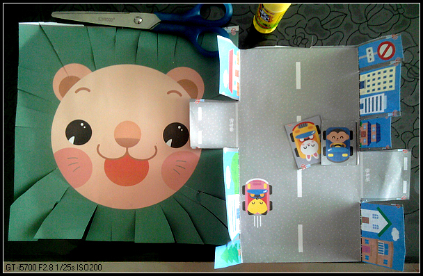 这是一个狮子,一个城市,剪下来折起来就变有了公路,配了两个纸汽车,宝宝跟我赛车。