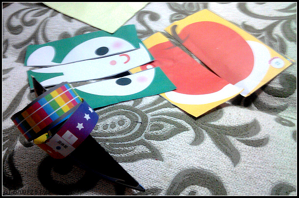 这就是那个海狮套环——剪一刀把个方形的海狮剪下来,中间对折,就成了海狮;纸环原本是个长条,剪下来粘住就成了圈,非常简单,但宝宝挺感兴趣,玩了很久。旁边放着的就是我觉得亏的那苹果和兔子,剪开对起来,忒简单了。