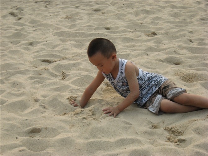 儿子看见沙滩立马脱掉鞋子在里面高兴的玩,只是我这当妈的没给孩子带沙滩玩具,可这似乎并没有影响到儿子的玩心,他拿着自己的车和另外一个小男孩玩起了开车的游戏(很可惜相机没电了,没能拍到)一会比赛谁的车跑得快,一会又比谁的地下停车场好(这是此次济南行儿子在万达广场附近见过一个地下停车场,他很感兴趣)玩的很是尽兴。