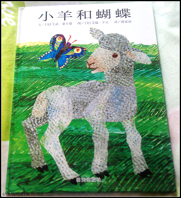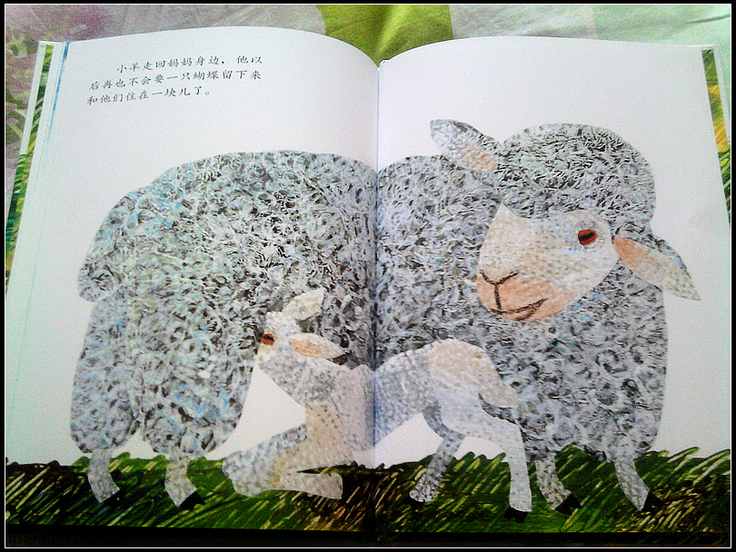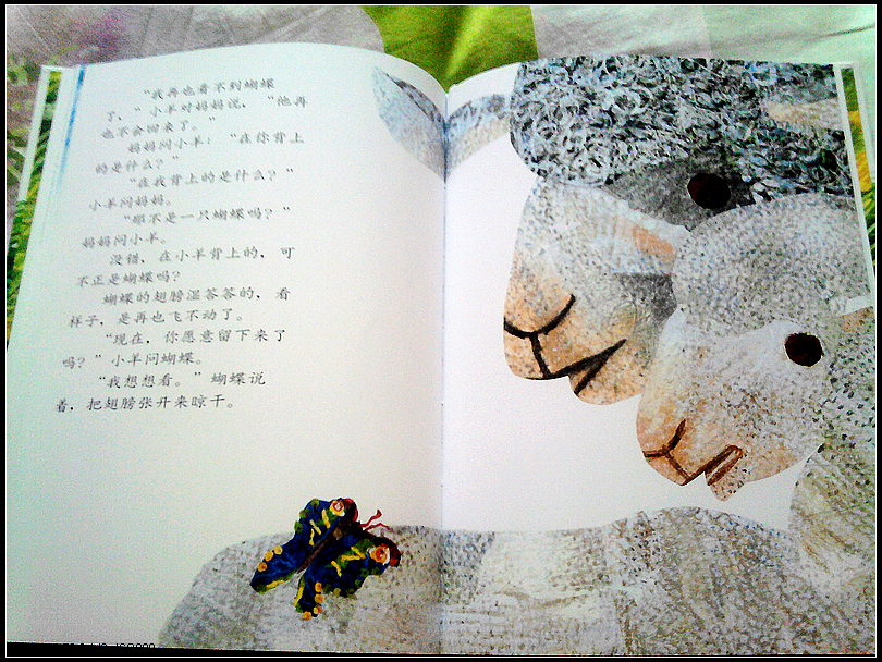 先来看封面,苍绿的大草原上,一只小绵羊和一只小蝴蝶对视,小绵羊不是雪白的,而是灰白的(我见到的小绵羊就是这个颜色,可不是真正雪白雪白的啊),身上仿佛还有一个一个的卷毛球;小蝴蝶艳蓝的翅膀上,明黄、翠绿、朱红点缀,鲜艳漂亮。