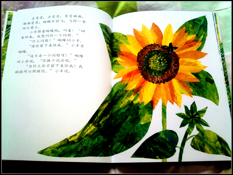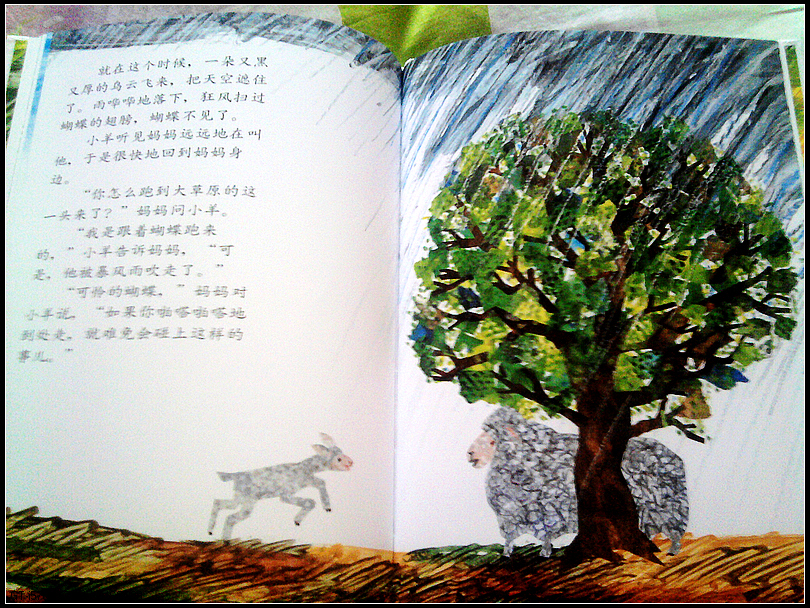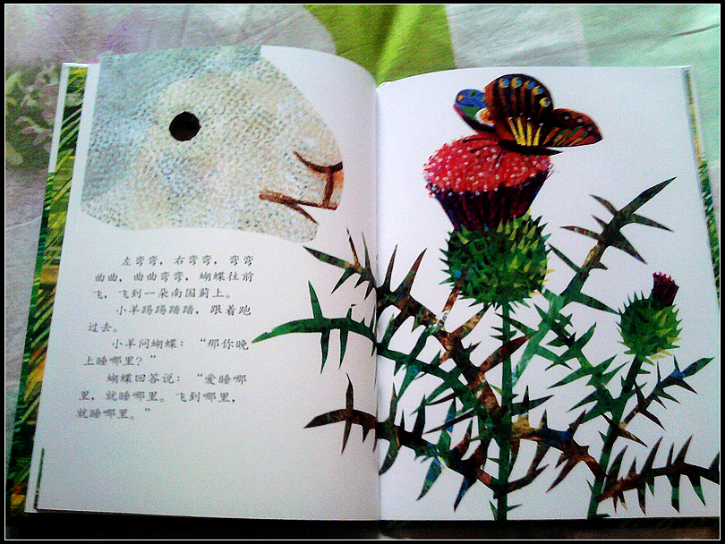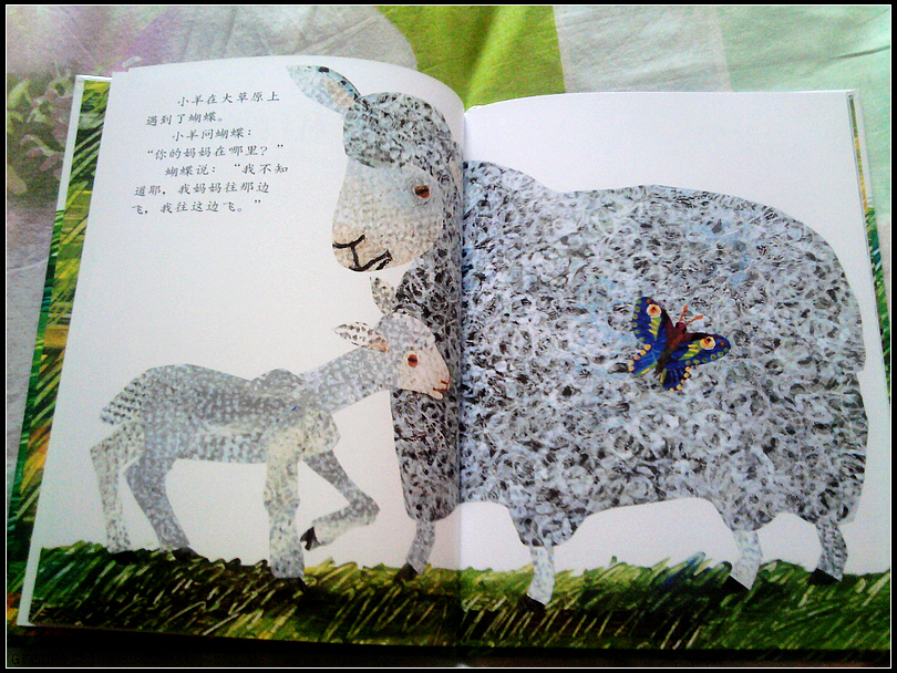 艾瑞卡尔的作品基本上你一看到书,就能感觉出来是出自他手。读书活动我分享《小羊和蝴蝶》这个故事的时候,一个妈妈就说,好像是艾瑞卡尔的作品啊,呵呵,风格明显。他的色纸制作,简单有趣,非常宜于孩子们动手。