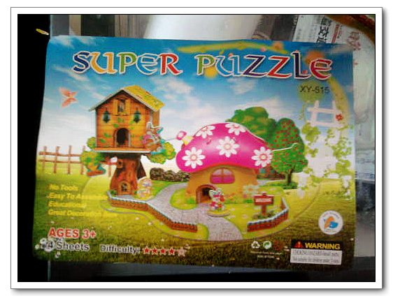 老公给孩子买了玩具,立体纸工,一次买了4个。很让我抱怨了一通——这是需要耐性的玩具,孩子肯定无法独立完成,可是如果大人动手太多,又失去了让孩子动手的乐趣。本想放放,等孩子大点再让她玩,谁知她早就看见了,一个劲得要求开工,拗不过,只好一起动手了。
