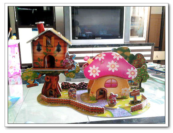 她最喜欢兔子,所以选的第一个,就是小兔子的家,非常卡通漂亮的图案。打开,里面有一张图纸,4页图板,每个图板上面有许多印好的图案,并且裁切过,只需要取下来按照标号安装即可。