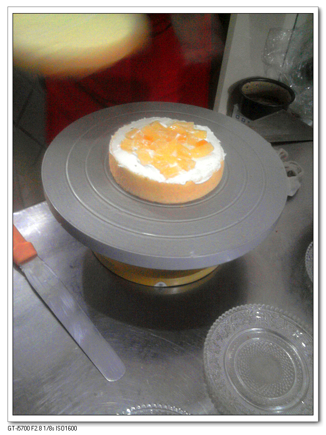 终于到我们做蛋糕了,大家一人取了一个蛋糕胚。店主从中间割开,放了一些杂果,再合上,开始铺奶油。牛妈告诉我,以前她们DIY的时候,都是自己铺的。店主一边做一边告诉我们,她们本来也是,但今天太仓促了,所以裱花什么的都来不及了。