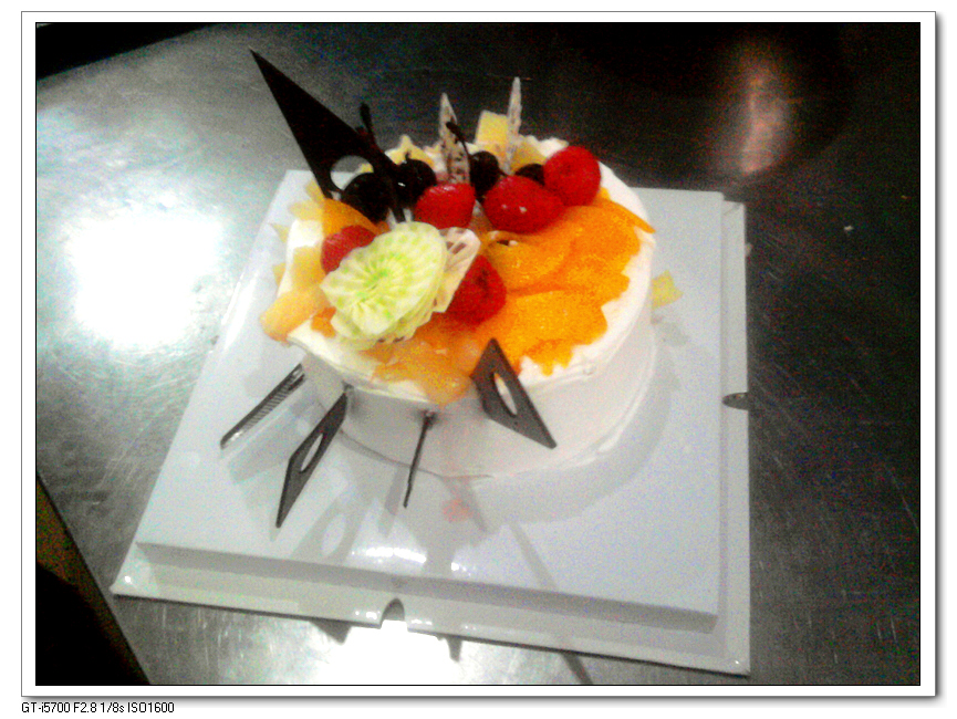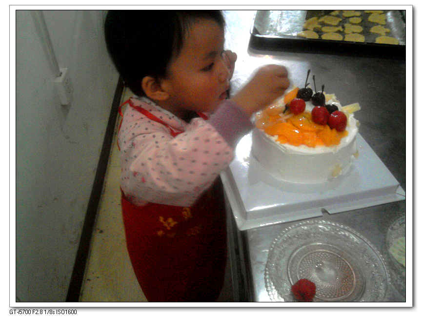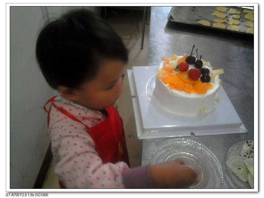 心里很有点不舒服,不过想着不能影响孩子的情绪,还是很开心得跟宝宝一起看蛋糕变成白色。每个人分到了一圈菠萝,一块黄桃,一堆巧克力片。我把黄桃和菠萝切开,让宝宝自己摆。店主说,你可以帮帮她,我看了看往蛋糕上面随意摆放的宝宝,说,没关系,随她创作吧,咱玩得本来就是个过程。