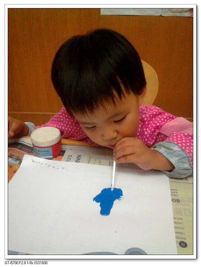 忽然想起该跟宝宝玩玩吹画了,一说,宝宝兴奋得不得了,尽管她还不知道吹画是什么意思,但凡是与颜色相关的东西,她都感兴趣。自己搬来了她的小桌子和小椅子,话说宝宝现在的力气,真是大了不少。