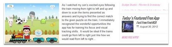“我儿子流露出兴奋的眼神,他看着火车从屏幕右边驶进来,随后上下打量了整个画面……他试着将正确答案放到火车上。我立刻认识到这款应用为孩子提供了一个锻炼注意力以及提高视觉跟踪能力绝妙机会……”