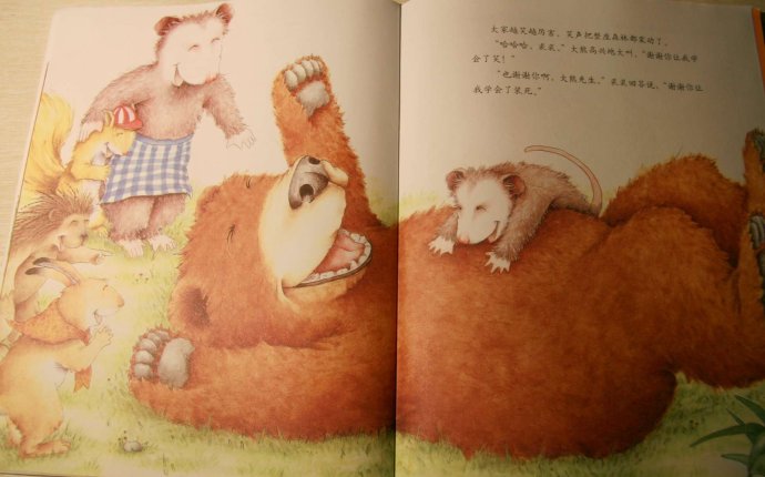 于是,负鼠妈妈带着小负鼠苦练装死的功夫,屡屡失败,直到真的遇见了敌人——一只凶巴巴的大熊。