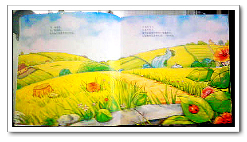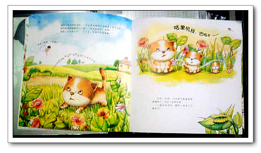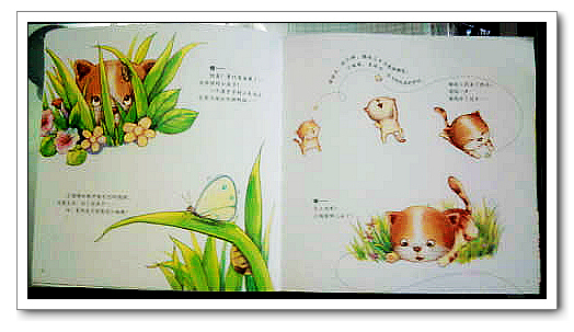 看看调皮的小糖球儿,作者把它画得多么活泼可爱。躲在草丛里的小心翼翼,伏在草地上时一脸好奇,一举一动,憨态可掬。