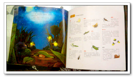 夜深了,糖球儿开始害怕。萤火虫点亮盏盏灯笼。记得小时候晚上乘凉,经常能见到萤火虫盘旋飞舞,可惜现在却不常见到了,宝宝只能从书里认识它。