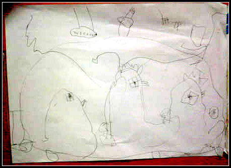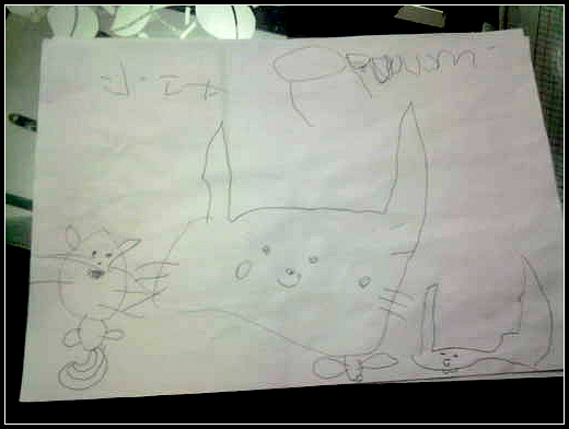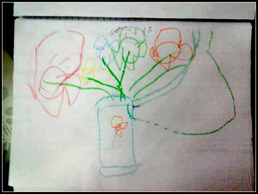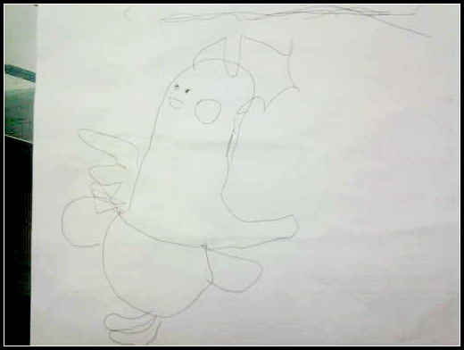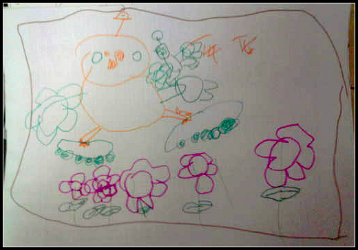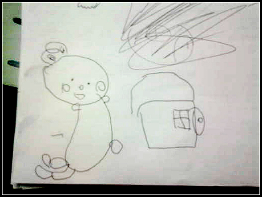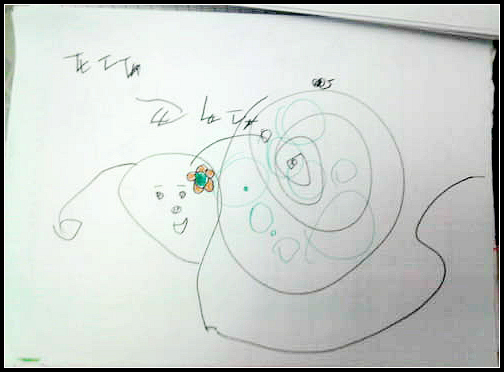 蜗牛妈妈。还有几张更漂亮的,身上的蜗牛壳用不同颜色的花装饰了出来,后面还跟着小蜗牛,不过后来被她一阵乱画,破坏掉了——话说貌似小孩子都有给自己作品上团涂的习惯?
