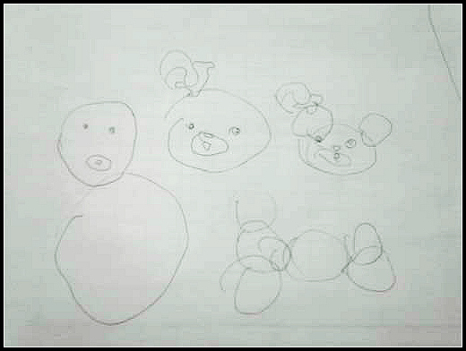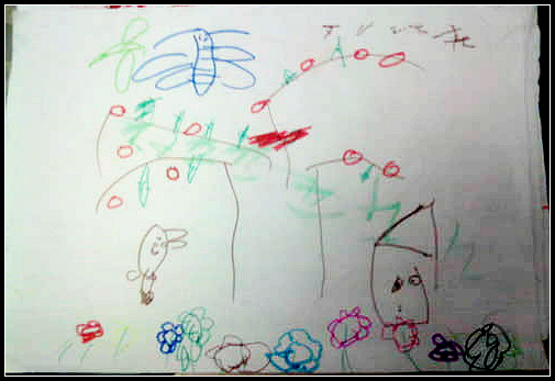 画里的事物也多了起来,不再只是家人,还会有幼儿园老师和她的好朋友。有耐心的时候,会把人物的衣服画满螺旋或兔子或花的图案。最有趣的是有一次,她画了一个大圈,里面是一个场景,大圈的下面有一溜3个小圈圈,据她说,这表示是梦,让我非常震惊。宝宝现在画画也不是埋头想象,当我给她当模特摆出姿势来的时候,宝宝是抬头观察一下我然后再低头去画,就像写生一样。