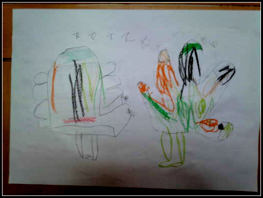 右边的是火鸡,左边的孔雀。上面那群没人能认识的“字”是宝宝写的:孔雀跟火鸡是好朋友……