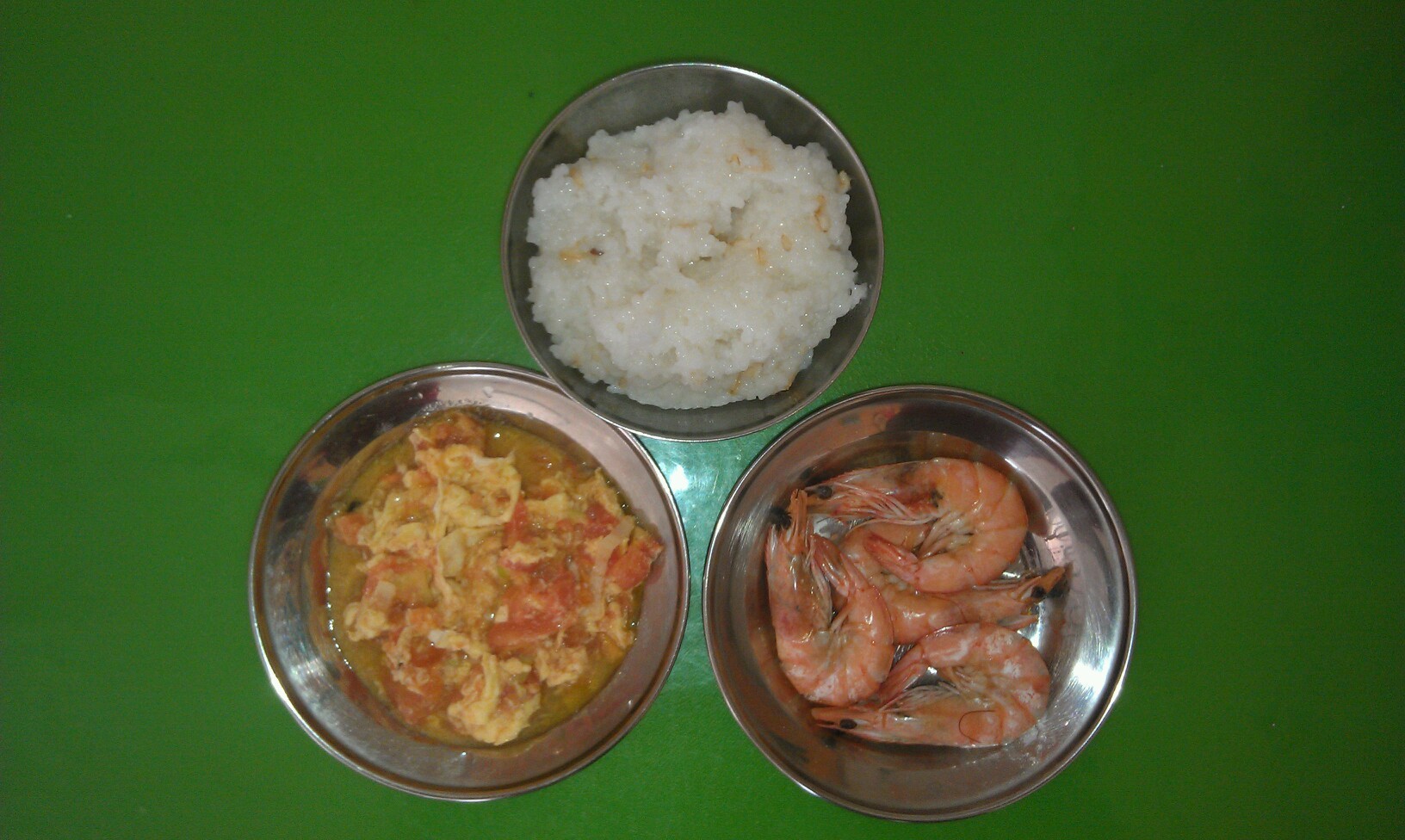 周四午:粥饭,鸡蛋炒柿子,盐水大虾