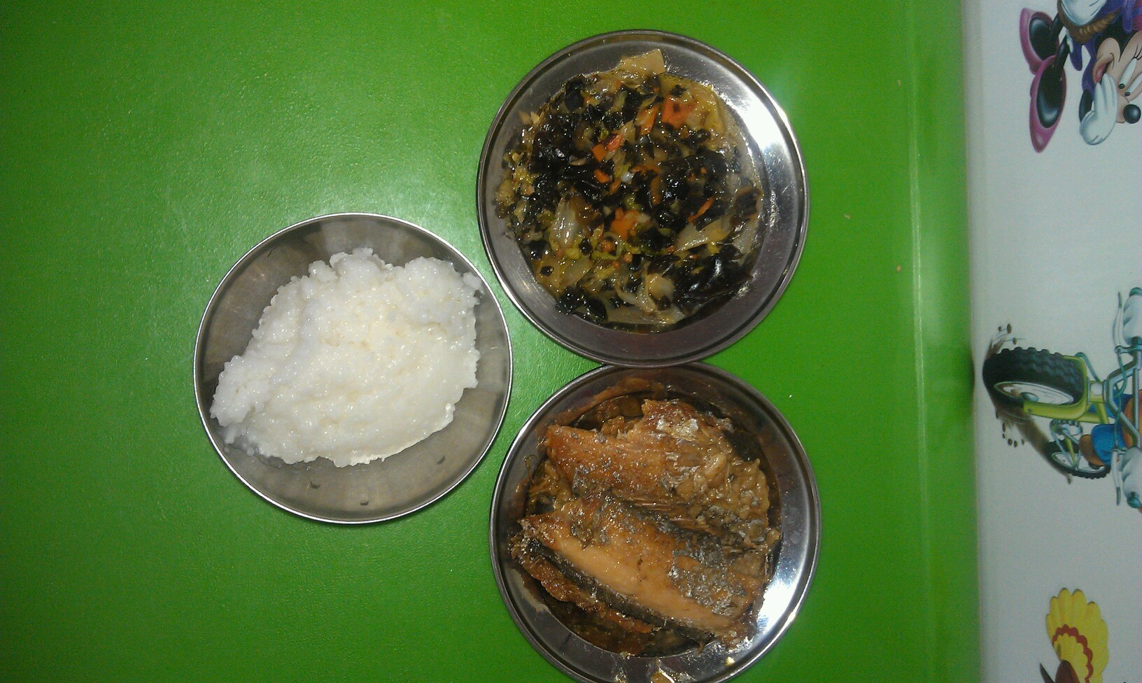 周四晚:粥饭,红烧海杂鱼,白菜木耳