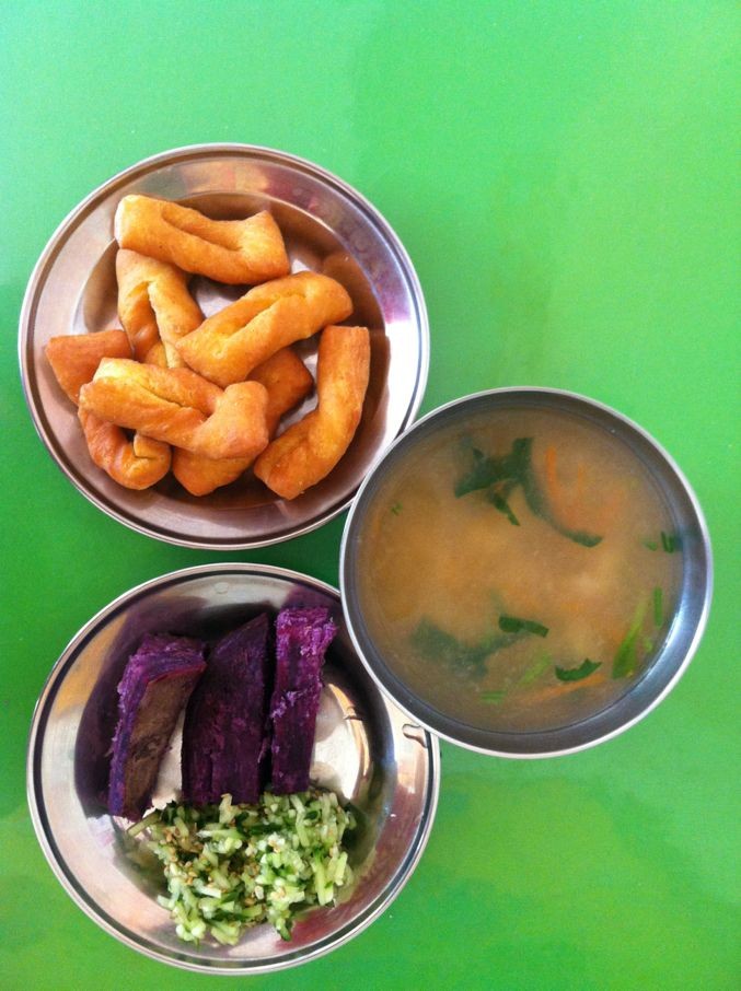 周五早:珍珠汤,香酥炸套环,蒸紫薯,黄瓜小咸菜