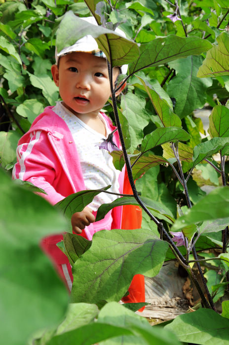 茄子秧比童宝都高,小家伙觉得采摘这件事既新鲜又好玩,乐在其中。