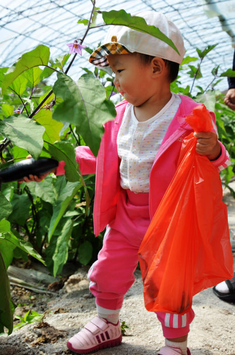 看,童宝在摘茄子,多卖力气啊!小家伙嫌茄子根部有刺扎手,拽着茄子的中间部分使劲儿。“爸爸,爸爸!”是呀,爸爸快来帮忙呀!塑料袋里的茄子都是童宝摘的,成绩不错吧?!